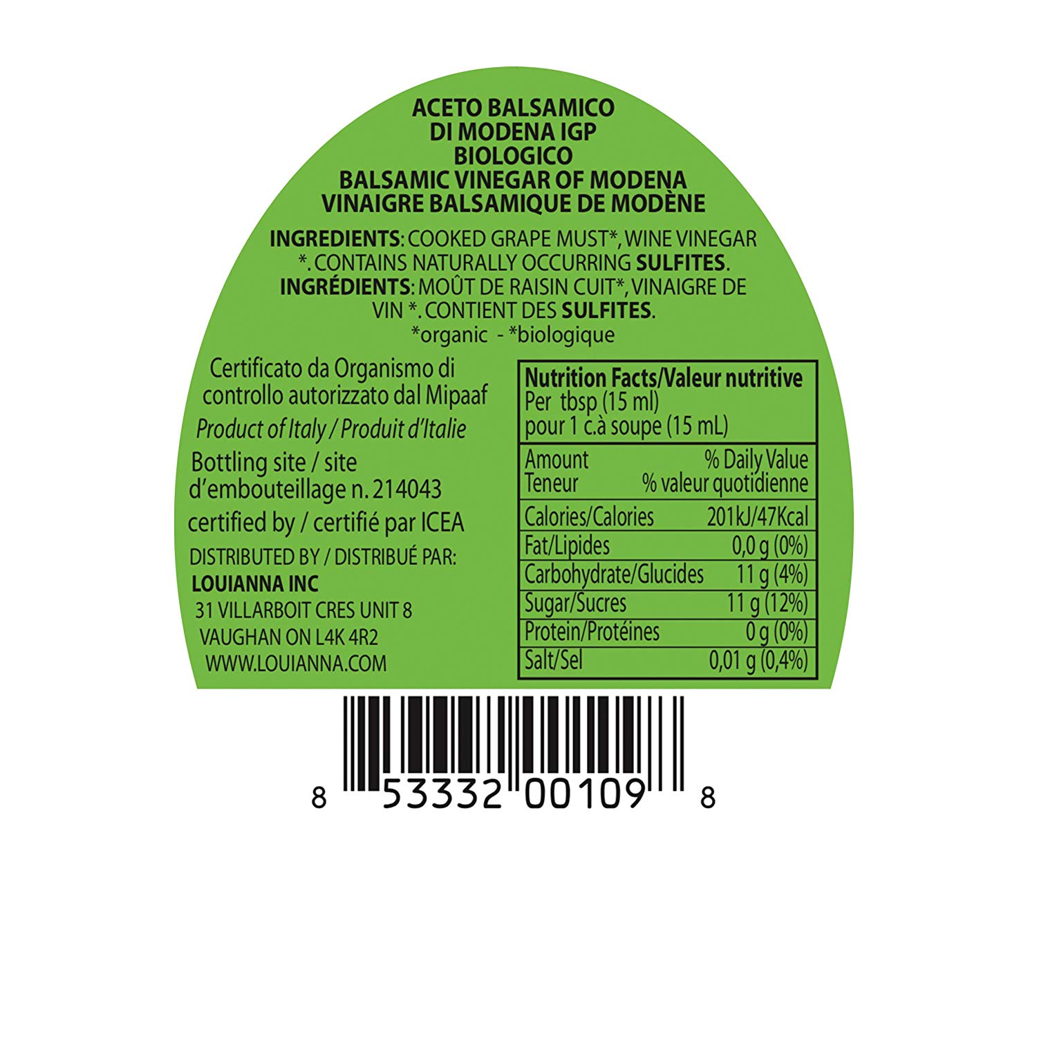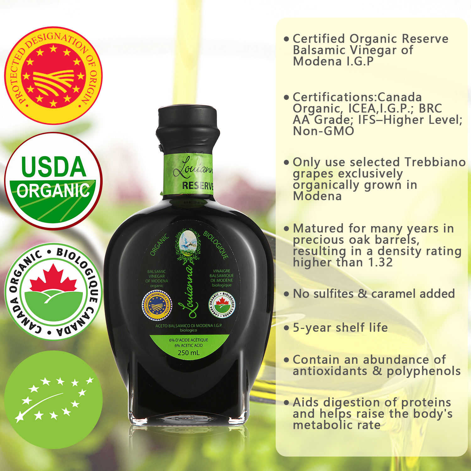 Louianna Certified Organic I.G.P. Balsamic Vinegar of Modena- 250ML-ICEA-BRC AA Grade-IFS Higher Level-Non-GMO- No sulfites Added – No Caramel Added-5 Year Shelf Life