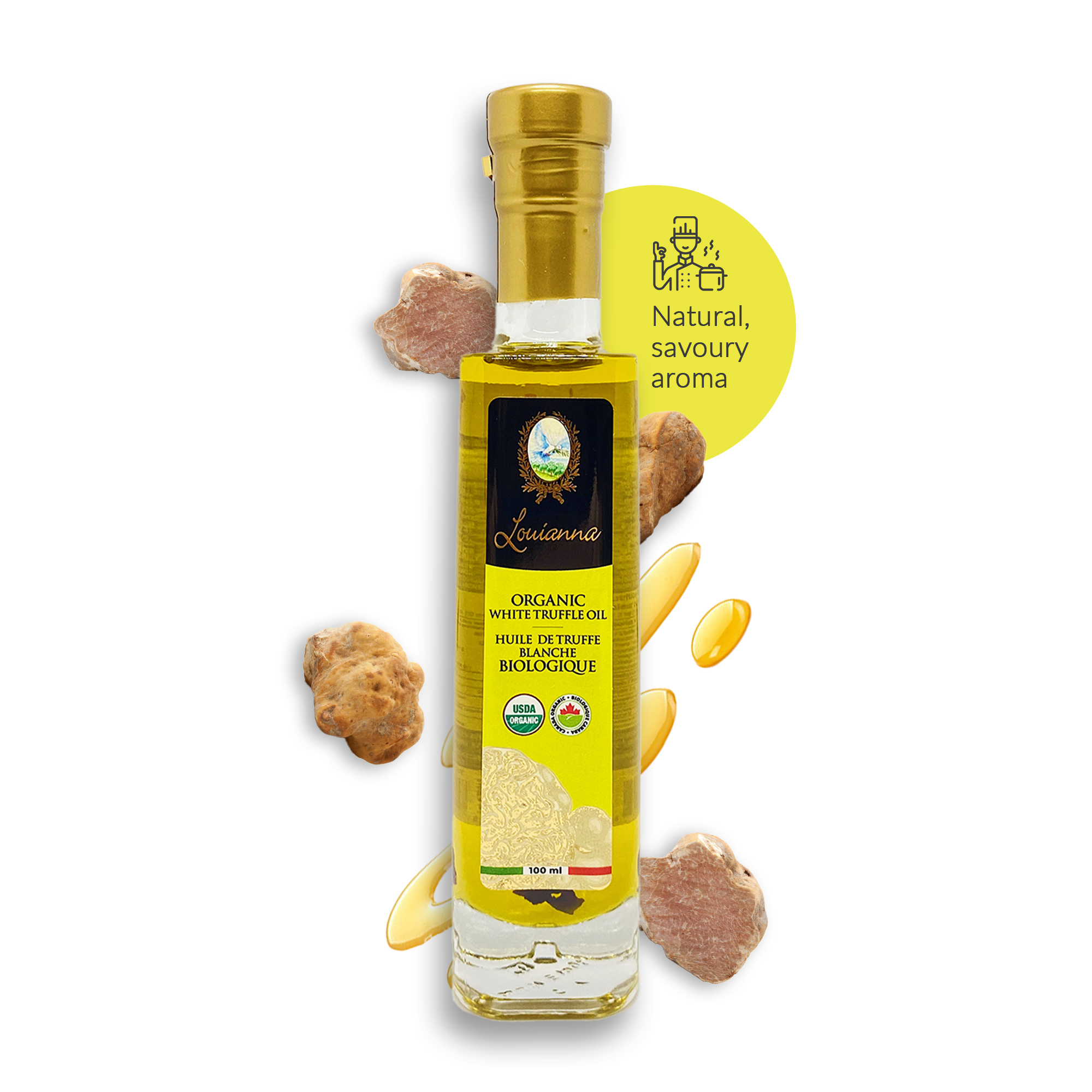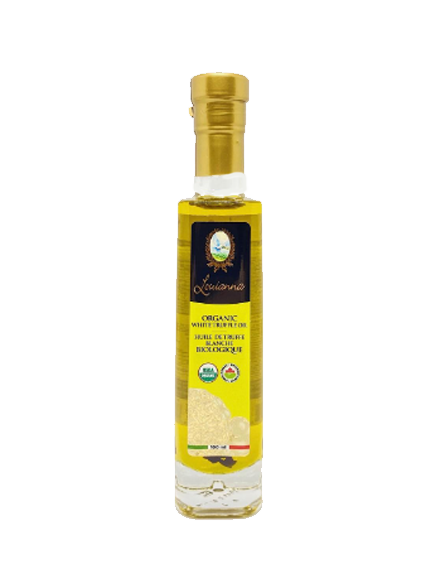 –This Louianna 100ml white truffle oil is certifiedorganic where it is hunted bytrained dogs on the mountains of Montorio Nei Frentani